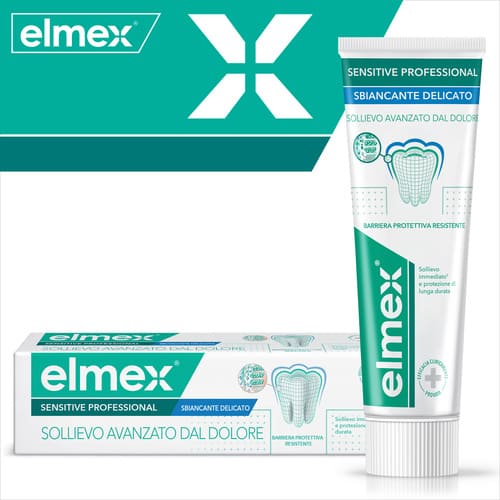 Il dentifricio elmex® Sensitive Professional™, il dentifricio elmex® Sensitive Professional™ Whitening, il dentifricio elmex® Sensitive Professional™ Ripara & Previene, il collutorio elmex® Sensitive Professional™ sono dispositivi medici CE. Leggere attentamente le avvertenze o le istruzioni per l’uso. Autorizzazione Ministeriale Rilasciata il 28/07/2016.